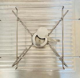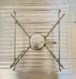 Completa di robusto supporto in acciaio inox e vano centrale per bruciatore a gel (ideale per mantenere il calore a lungo).