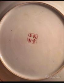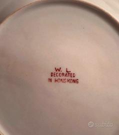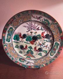 Splendido set di 3 piatti ornamentali in pregiata porcellana cinese, finemente decorati a mano. Il set è composto da: • 2 Piatti con Draghi Imperiali: Raffigurano il classico motivo dei due draghi che si rincorrono intorno alla perla fiammeggiante, simbolo di saggezza ed energia. Colori vivaci (verde, blu e rosso corallo) con bordura geometrica intricata. • 1 Piatto con Galli e Fiori: Un decoro più naturalistico che rappresenta galli tra fiori di pesco e motivi floreali, con una ricca bordura "famiglia rosa" e dettagli in oro zecchino. Dettagli Tecnici: • Origine: Hong Kong (marchio "W.L. Decorated in Hong Kong"). • Marchi: Sul retro è presente il marchio rosso di manifattura e il sigillo a quattro caratteri (乾隆年製 - Qianlong Nian Zhi), che indica lo stile dell'epoca Qianlong, tipico della produzione artistica del XX secolo. • Stato: Eccellente stato di conservazione. Nessuna sbeccatura, crepa o restauro. I colori sono ancora brillanti e i profili dorati ben definiti. • Dimensioni: drago diametro 21 - gallo diametro 23 • Extra: Inclusi nel prezzo i supporti da esposizione in metallo visibili in foto. Perfetti per arredamento in stile orientale, collezionismo o come regalo di classe. Spedizione: Imballaggio professionale ultra-protetto con pluriball e scatola rinforzata per garantire l'integrità durante il trasporto.