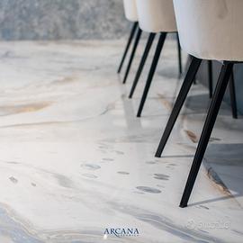 Arcana presenta infine un elegante marmo nero con sinuose venature bianche irregolari, dolcemente ondulate e piccoli tocchi dorati che aggiungono profondità. Aster-R satinato opaco fornisce una sublime setosità, e Aster- R Polished irradia una raffinatezza aggiunta equlibrata e una maggiore intensità di colore grazie alla sua lucidatura ad alta brillantezza.
