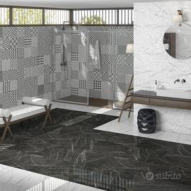 Arcana Thalassa piastrelle bagno imitazione marmo . La collezione di piastrelle in ceramica Thalassa di Arcana propone piastrelle che ricordano il marmo nero con venature bianche. Questa combinazione tradizionale di bianco e nero non si stanca mai, quindi si adatta sia agli interni classici che alle stanze moderne. Grazie al suo colore scuro, sarà la scelta giusta soprattutto per bagni di grandi dimensioni. Il trattamento superficiale resistente al gelo consente di utilizzare questa piastrella anche in ambienti esterni. I blocchi per pavimentazione Arcana Thalassa sono disponibili nelle dimensioni di 59,3x119,3 cm.