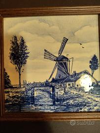 piastrella in ceramica lavorata a mano con riproduzione di un mulino a vento olandese. Delft Blue hand painted Holland misura cm. 16,5x16,5
