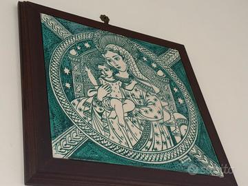 Si tratta di una formella in ceramica smaltata incorniciata, che raffigura una Madonna con Bambino in uno stile che richiama l'arte bizantina o romanica, ma con un'esecuzione moderna.