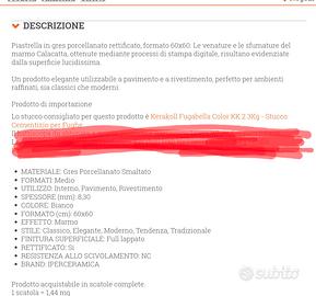 Vendo avanzo di Piastrelle comprate al negozio Iperceramica di GRAVELLONA TOCE (VB) , sono 6 pacchi da 1,44 mq, totale fanno 8 metri quadri nel prezzo è incluso avanzo di un sacco intero mai usato di colla di 25kg kerakoll h40 colore bianco, e due sacchi di stucchi anche questi nuovi kerakoll colore kk2 bianco , regalo avanzi di piastrelle tagliate . ho ristrutturato il mio bagno a gennaio 2026 . solo consegna a mano Gravellona toce e dintorni.