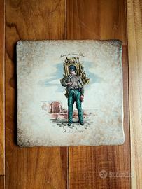 3 piastrelle Decorative di vecchi mestieri, scritte in francese, made in Italy. Possono servire anche come poggia pentola. Una delle tre ha un angolo un po' sbeccato. Misura 20x20 cm.