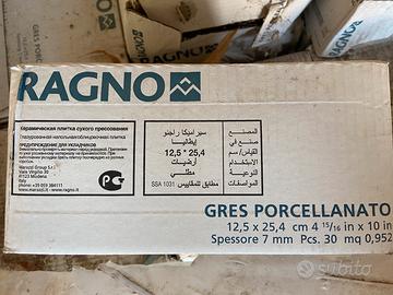 Piastrelle in gres porcellanato marca RAGNO 1ª scelta, ancora imballate e conservate al coperto, dimensioni 12,5x25,4 sp.7mm PLAZA tono shade, ideali per rivestimenti di balconi, garage, marciapiedi.