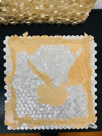 Prezioso mosaico in alluminio lucido/spazzolato composto da tesserine esagonali con superficie 3D , colore oro francese (chiaro). Montato su rete 30x30 spessore variabile 4/6 mm. È stato smontato da una parete espositiva,perciò il retro dei fogli vanno ripuliti di alcuni punti di colla siliconica , come si vede in foto. Il lato a vista del mosaico è nuovo e perfetto. Adatto per la posa in pareti interne. Lo vendo a singoli fogli 30x30 ,€16 al pezzo.