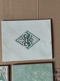Bellissime piastrelle per pavimento e rivestimento in tonalità verde chiaro e relativi inserti decorativi.