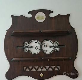 Elegante piattaia da parete realizzata artigianalmente da un unico pezzo di legno massello, con lavorazioni curate e dettagli decorativi raffinati. Caratterizzata da: • Ripiano superiore portaoggetti/piatti • Supporti inferiori per esporre piatti in sicurezza • Ganci appendiabiti o porta strofinacci • Inserto decorativo centrale in ferro battuto e ceramica • Struttura solida e resistente Ideale per cucina o soggiorno in stile rustico, classico o country. Perfetta per esporre piatti, tazze o oggetti decorativi, aggiungendo calore e carattere all’ambiente. Condizioni: Ottime (come da foto)
