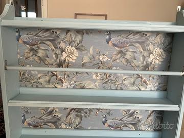 Piattaia ikea rifatta in colore azzurro e carta da parati. 4 ganci per appendere tazze. Ha 2 ganci per essere appesa al muro. Dimensioni: larghezza 80 cm, altezza 77 cm, profondità 14cm. Vendo 55 euro. Solo consegna a mano no spedizione