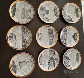 Vendo 9 piatti vintage originali di Piero Fornasetti, realizzati in Italia negli anni ’60, parte della serie dedicata alle specialità culinarie di Torino con ricette illustrate e immagini di Torino sul piatto. Ogni piatto è in porcellana con bordo dorato, decorato artisticamente e marcato sotto la base.