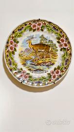 Ogni piatto presenta un'illustrazione dettagliata di un animale selvatico in un ambiente naturale, circondata da un bordo floreale.