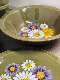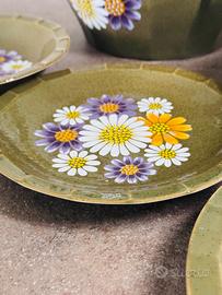 Vendo splendido servizio vintage anni ’70 con decorazione floreale multicolore su base verde oliva, decorato a mano.