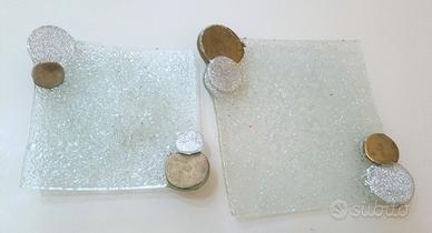 2x Piatti in vetro trasparente con trama ruvida e cerchi in colore oro e argento Dimensioni: - piatto grande: lato 16 cm - piatto piccolo: lato 12 cm