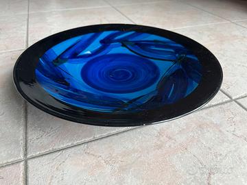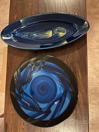 Due piatti decorativi in ceramica smaltata di colore blu cobalto intenso, utilizzabili come piatti da portata o come elementi decorativi