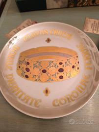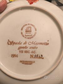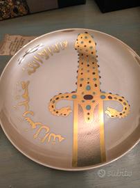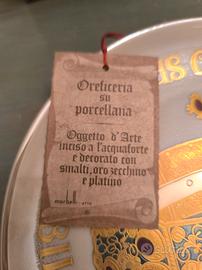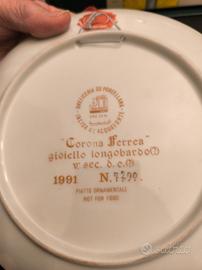 patti di oreficeria su porcellana decorati con oro e platino spada di Maometto gioiello arabo e corona ferrea di Monza piatto italico longobardo. Acquistabili anche singolarmente.