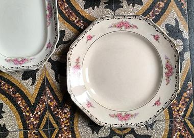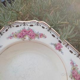 piatti vintage in fine porcellana, quadrati con angoli coronati, decorati con ciuffi di rose rosa, bordi in oro 22K