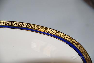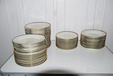 Elegantissimo e completissimo servizio piatti per 12 persone di "Richard Ginori" degli anni '60. Il servizio è in porcellana pasta avorio con filo in oro zecchino e blu cobalto e si compone di 36 Piatti Piani, 12 Piatti Fondi, 12 Piatti Frutta, 1 Insalatiera, 1 Salsiera, 1 Zuppiera, 2 Raviere, 2 Piatti Tondi da Portata, 3 Piatti Ovali da Portata, per un totale di 70 PZ. Il servizio è in perfetto stato di conservazione, nessuna sbeccatura o difetti nel decoro, raramente usato. Per eventuale spedizione garantisco imballaggio accurato ma non rispondo di possibili danni. Preferito ritiro in loco. Valuto proposta ragionevole.
