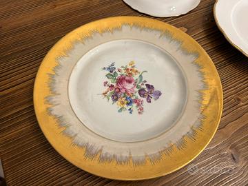 Piatti in cercamica 1 piano grande bianco con contorno dorato 4 piani medi bianchi con contorno dorato 3 piani piccoli bianco con contorno dorato 5 piani piccoli decorati 1 piano medio decorato