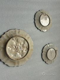 Piatti in maiolica artigianale di Deruta. Tre pezzi, due di uguali dimensioni (diametro circa 15cm) e uno più grande (diametro circa 20cm).