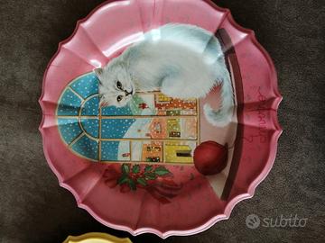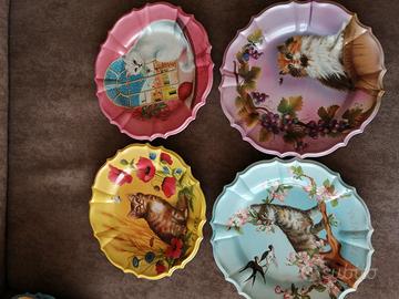 Sette piatti in plastica dura con diversi soggetti da appendere a parete. 4 con gatti e tre con cani nelle diverse stagioni. Mai usati o appesi a parete. Non per uso alimentare.