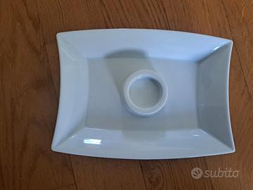 Piatti rettangolari in porcellana bianca , cm 14,5x22, con incavo centrale - diametro cm. 4,5 - progettato per salse, antipasti, pinzimonio, uova.
