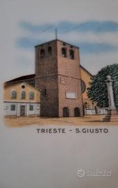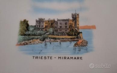 Raffinato set da dessert in porcellana di Bavaria, con immagini evocative della città di Trieste, impreziosite da una cornice dorata. Il set comprende 7 piatti: 6 da dessert e 1 più grande da servizio. E' stato un regalo di nozze di anni fa, ma mai usato per il pregio.....tenuto in vetrina.