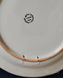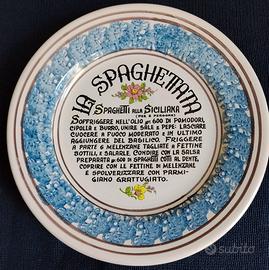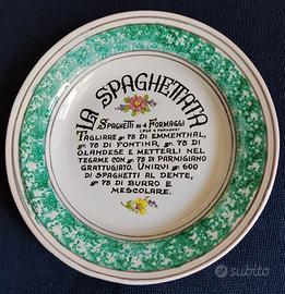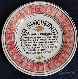 Vendo piatti decorativi "La spaghettata" realizzati dagli Artisti della ceramica di Cava dei Tirreni (Sa). Tre sono piatti piani (foto 1,2 e 3) e due sono piatti fondi (foto 4 e 5). Diametro cm. 23,5 i piani e cm. 23 i fondi. Posteriormente hanno i fori che permettono di essere appesi a una parete (foto 6). Prezzo cadauno euro 10,00. Vendita singolo o multipli.