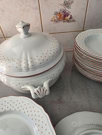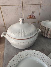 Servizio piatti Richard Ginori originale in porcellana, decorazione con dettagli dorati. Composto da: 11 piatti fondi 3 piatti piani 1 zuppiera con coperchio Condizioni molto buone, nessuna rottura. Servizio incompleto.