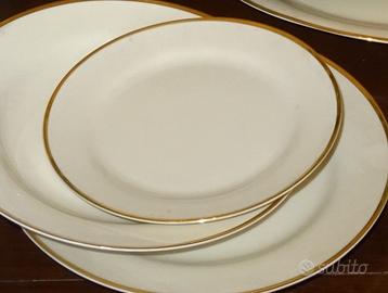 Servizio piatti porcellana filo Oro, doppia portata. Porcellana Bavaria TIRSCHENREUTH. N° 12+12 piatti piani; n° 12 piatti fondi; n° 12 piattini; n° 1 zuppiera; n° 1 piatto portata ovale; n° 1 portata rotondo fondo; n° 1 piatto portata rotondo piano.
