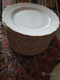 piatti in porcellana come da foto. sono 11 fondi, 13 piani, 12 piccoli, 1 piatto ovale da portata e 1 insalatiera. volendo ho zuppiera e altri piatti da portata abbinabili praticamente identici senza i fiorellini rosa. da ritirare a Monteverde