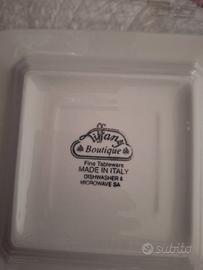 servizio nuovo mai usato x 6 persone Tiffany quadrati: 6 fondi, 6 piani, 6 sottopiatti 6 frutta , 1 portata, 1 insalatiera. ritiro a mano
