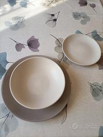 Servizio da sei coperti, in totale diciotto piatti, bicolore tenue, usati poco, marca Tognana. Sono moderni, qualche piatto è leggermente segnato, si veda foto. Euro 20 di tutti. Non trattabile.