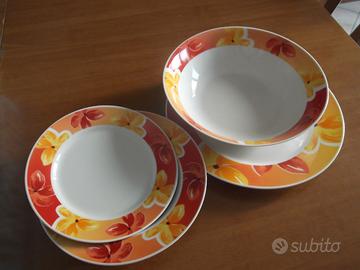 Piatti in porcellana decorati a fiori giallo e rossi, modello MELANIE: 4 forndi diametro cm. 22, 3 piani diametro cm. 27, 5 frutta diametro cm. 19, 2 insalatiera diametro cm. 24xcm. 7 altezza, in blocco € 20.