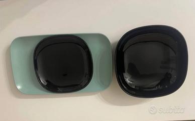 6 piatti verdi rettangolari, 6 piatti fondi neri lucidi, 6 piattini quadrati neri lucidi.