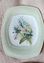 Set di 5 piatti rettangolari con decorazioni raffiguranti fiori piante e uccelli. Fine ceramica marchiata CTP Simbolic Child. Cm 21 x 17.