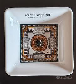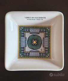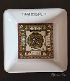 Set di tre piattini in porcellana, Roberto Capucci per Palazzo Grassi, cm. 10 x cm. 10, commemorativi mostra "I Greci in occidente" Palazzo Grassi - Venezia 1996. Il disegno al centro dei piatti richiama motivi artistici o architettonici dell'antica Grecia, in linea con il tema della mostra. Nuovi, nella loro scatola.