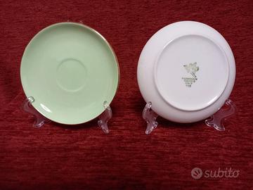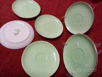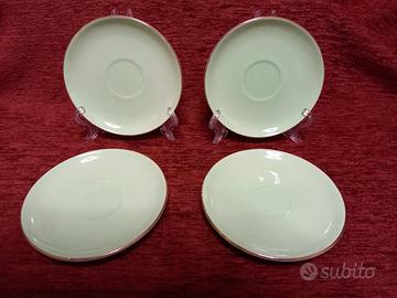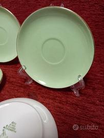 Un set di piattini di ceramica della Pagnossin, di colore verde pisello con il bordo circolare e filo dorato. Sulla parte posteriore c’è il marchio della Pagnossin. Sono tutti integri, senza aloni o lesioni, mai usati degli anni 1970 sono in ottime condizioni.