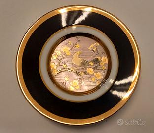 piattino decorativo della collezione The Art of Chokin, caratterizzato da un'incisione di un uccellino con fiori realizzata con oro 24K e argento.