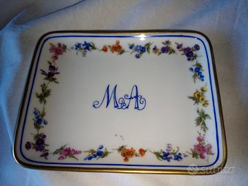 Vendo elegante piattino in Porcellana con marchio raffigurante tre spade incrociate coronate sul retro al centro e dicitura "Per Tiffany" sul retro in basso a destra.