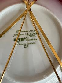 Piattino in porcellana prodotto a Limoges, Francia nello stile tipico e con pregiati bordi rifiniti in oro.