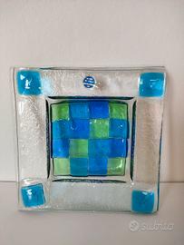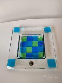 Piattino in vetro di Murano, caratterizzato da un design a scacchi colorati realizzato con la tecnica del vetro fuso o "millefiori".