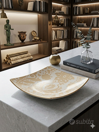 Splendido piattino ornamentale (o svuotas tasche) in pregiata porcellana di Limoges, Francia. Il pezzo presenta una forma quadrata moderna con bordi leggermente rialzati e una raffinata decorazione damascata color crema su fondo avorio. - Materiale: Porcellana di Limoges autentica. - Finiture: Bordatura e decorazioni realizzate in Oro 22K (come indicato dal marchio sul retro: "22K Decor or veritable"). - Design: Motivo floreale/barocco classico ed elegante. - Origine: Prodotto in Francia (Marchio LG Limoges). - Condizioni: Ottime condizioni vintage, senza sbeccature o crepe. Sono presenti ancora le etichette originali del rivenditore sul retro. Perfetto come elemento decorativo, piccolo vassoio da esposizione o come idea regalo raffinata per chi ama l'antiquariato francese. - Dimensioni: L22 P22 H2cm ca.