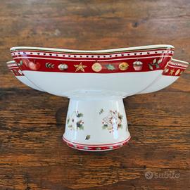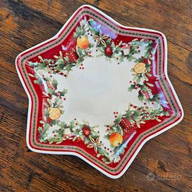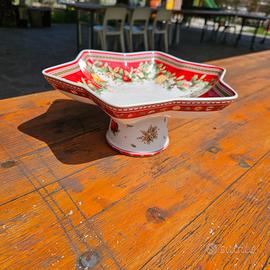 Alzatina a stella su piedistallo della collezione Winter Bakery Delight di Villeroy & Boch — porcellana premium con motivi natalizi rosso/verde, forma a stella esagonale, piedistallo cilindrico. Perfetta per servire pandoro, panettone o dolcetti natalizi. Si trova tra i 57 e i 67 euro nei negozi on line. È in perfette condizioni. Priva di confezione originale.