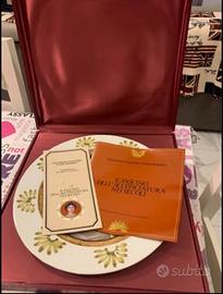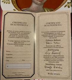 Piatto pubblicitario dell'azienda Wella del settore cosmesi e cura dei capelli della serie: il fascino dell'acconciatura nei secoli, con la splendida immagine di una donna pompeiana e la sua acconciatura d'epoca; illustrazione a cura di Federico Bellami 1980. Piatto in finissima porcellana bianca cotta a 1410 gradi, decorata a colori, prodotto da Ancap (made in Italy dal 1964) per Wella, edizione a tiratura limitata e numerata: 4167/5000. Con certificazione e confezione originale