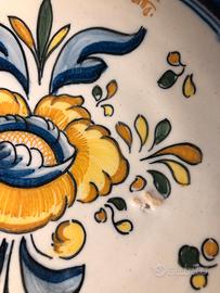 Piatto antico in terra cotta smaltato. Firmato. LA. TRINIDAD. p.PR20BISPO. Diametro cm 23. E una fondina: altezza cm5,5. Garantisco imballo anti urto. Rif 413.
