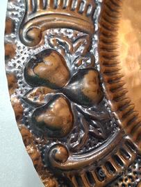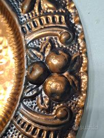 Piatto da parete o da appoggio in rame con lavorazione a sbalzo. Diametro cm.25 . Presenta sul bordo riproduzioni di frutta e motivi diversi.