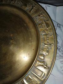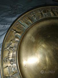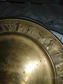 Piatto in ottone diametro 26 gioielleria caldironi per motta il bordo presenta a rilievo rappresentazioni di vita medievale e lavorazione del panettone SC65 spedisco