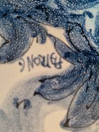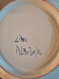Piatto in ceramica centrotavola dipinto a mano con decorazioni blu (2 angooletti) Artista Lino Patrone di Albisola. Diametro cm. 32. Vendita in loco.