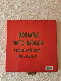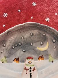 Bellissimo piatto natalizio in ceramica con scena invernale dipinta a mano: pupazzo di neve, bosco con casetta, cielo stella e slitta con renne. Vendo con propria scatola originale.