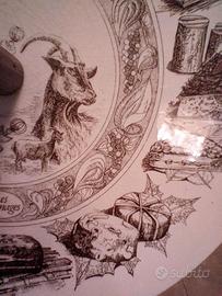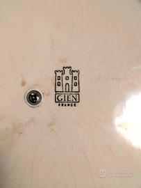 Piatto da portata vassoio a tema "Les fromages" celebrazione della cucina francese, realizzato in ceramica a craclé e dipinto finemente a mano dalla nota casa francese GIEN, garanzia di qualità autenticità fin dal 1800. Il diametro di 30 cm ed il pratico manico in legno, smontabile per lavarlo in lavastoviglie, lo rendono funzionale per l'uso, ma è anche un oggetto d'arte della serie che Gien ha dedicato alla gastronomia francese con decori sottosmalto nelle tonalità seppia e marrone. per uso comune e collezionisti delle grandi ceramiche francesi dell'800.